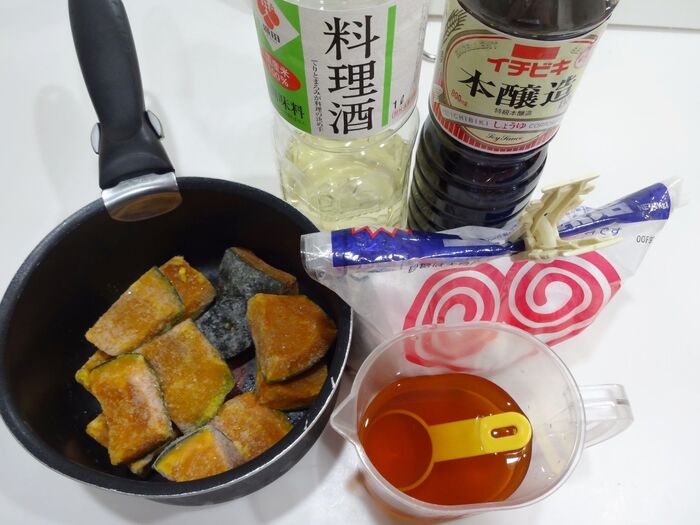 冷凍カボチャを鍋に敷き詰めて並べます。