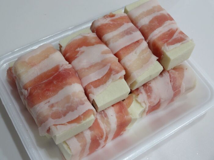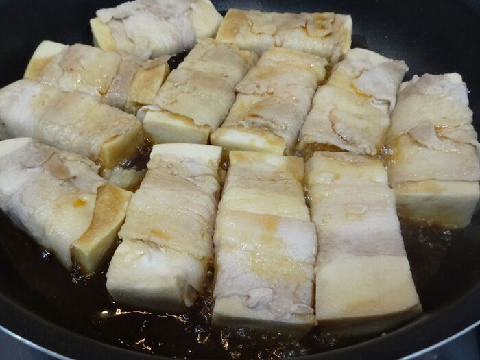 フライパンに、豚バラの巻き目が下になるように並べてゆきます。