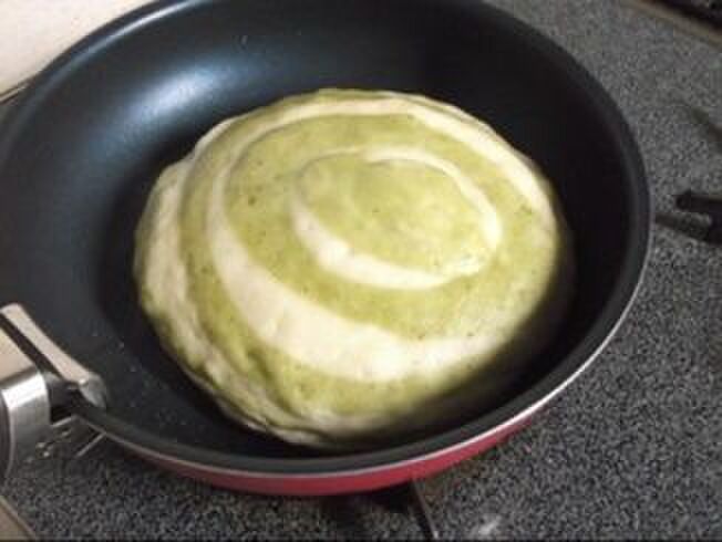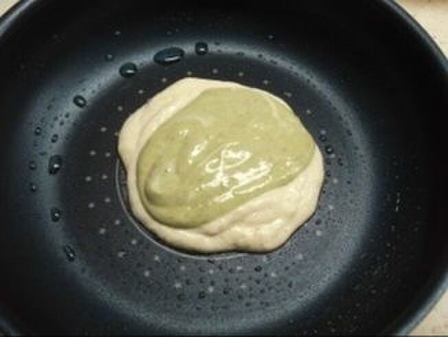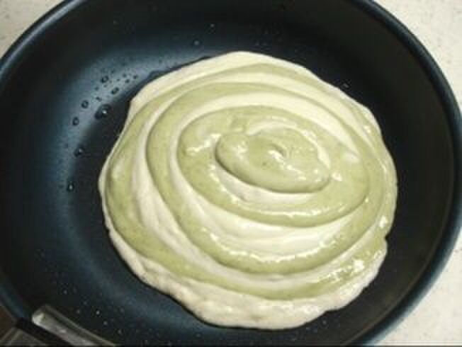 火にかけていないフライパンに薄く油を塗って、プレーン生地と抹茶生地を交互に入れる。
