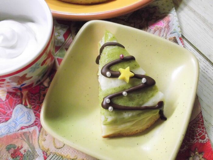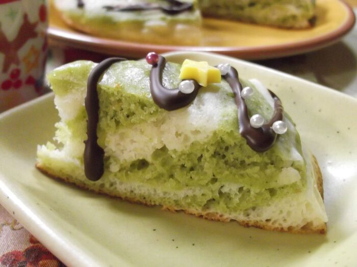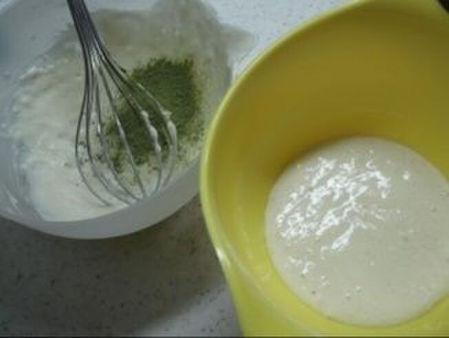 生地を半分に分け、半量に抹茶パウダーを混ぜる。