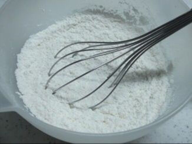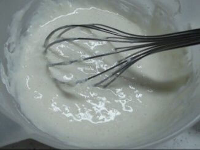 ◎を加えて、粉っぽさがなくなるまで混ぜる。(※混ぜすぎない)