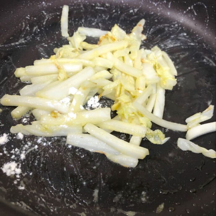 フライパンにオリーブオイルを入れて、白菜の芯部分を入れしんなりするまで炒め、薄力粉を入れて、粉っぽさがなくなるぐらいよく混ぜ合わせる。《中火〜弱火》
