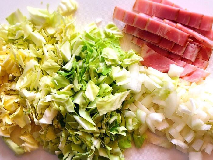 1.ベーコンは1cm幅に切る。キャベツと玉ねぎは粗みじん切りにする。