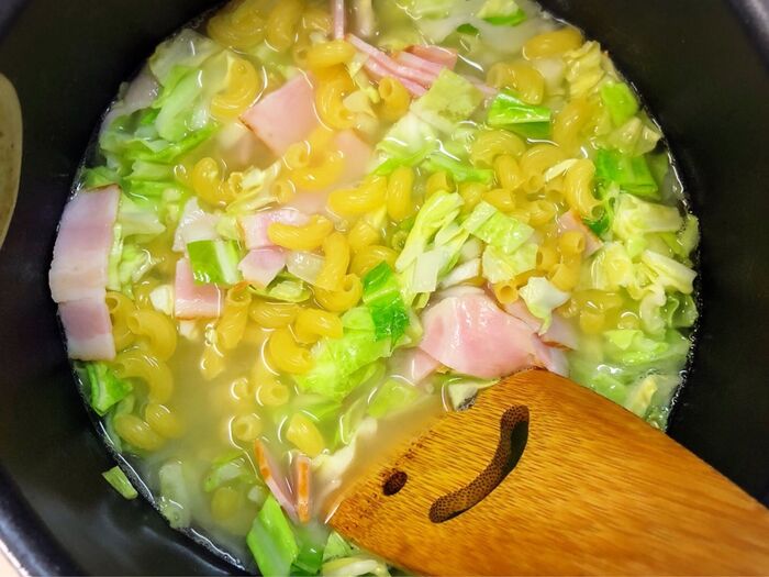 2.バターを中火で熱した鍋で1を炒める。キャベツがしんなりしたら●を加え、マカロニの袋の表示時間通り煮る。(たまに混ぜながら)