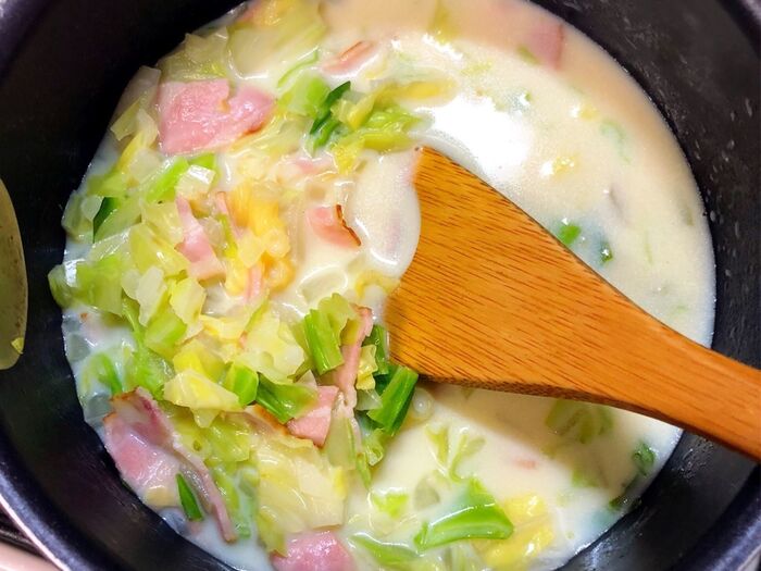 3.マカロニが柔らかくなったら☆を加え、塩こしょうで味を調え、沸騰直前で火を止める。器に注ぎ、粗挽き黒こしょうを振る。