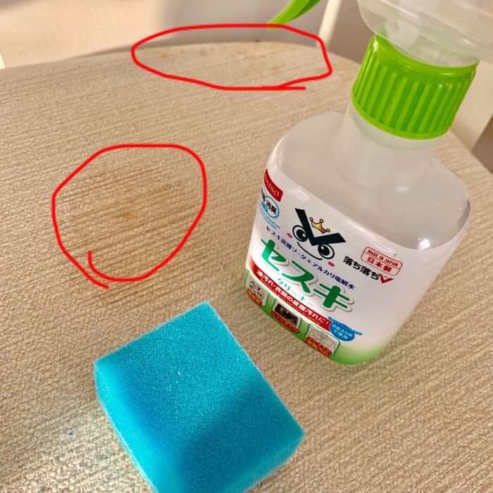 セスキスプレーをシュッシュしながらスポンジでポンポン上から叩きます。