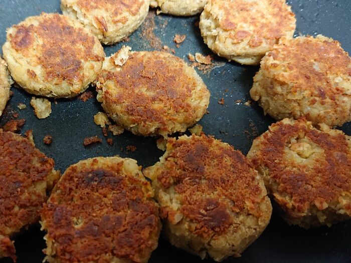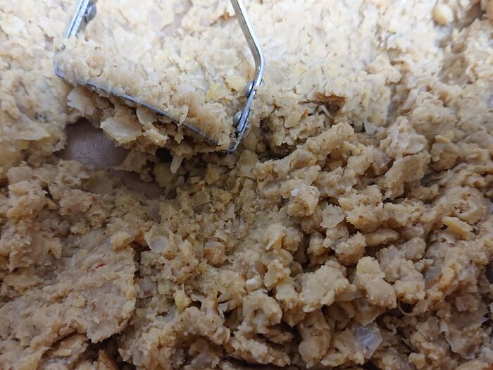 玉ねぎ、ニンニクをソテーして、ひよこ豆、スパイスを加えマッシャーで潰す。