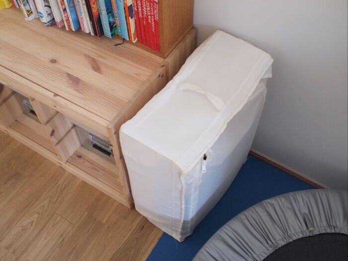 ベッド下など収納する場所があれば、寝かせて収納した方が効率良くスペースを使えますが、ない場合でも、立てることで比較的コンパクトに収納できます。
