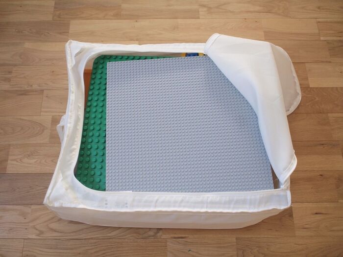 たまたま使っていた「レゴの基礎版38cm×38cm」を、最後にふたのように入れているのですが、この基礎版のおかげで、ブロックがボコッと出っ張ってくるのを抑えてくれて、全体の安定感にも繋がっている気がします。