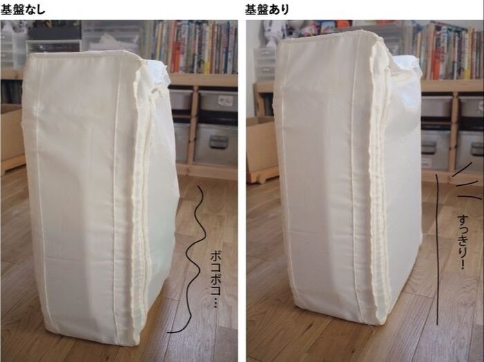 立てて収納するときのポイントは、大きめの「基礎版」をふたのようにつかうこと。