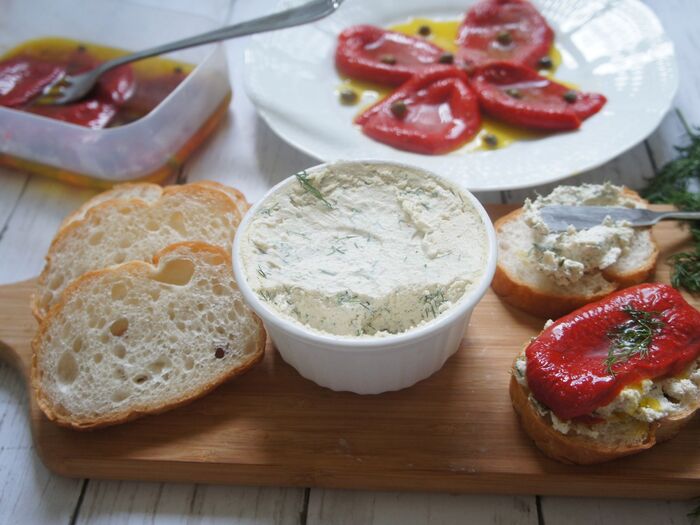 1のクリームの中に2のなめらかにした木綿豆腐に刻んだディルとシーソルトと粗びき胡椒を入れてホイッパーで攪拌しココットに入れて冷蔵庫で落ち着かせる。