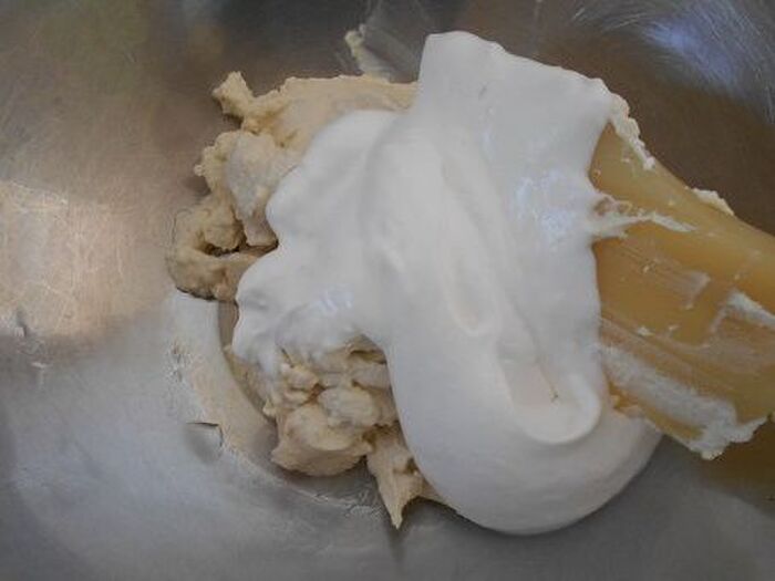 豆乳クリームはボウルに入れてホイッパーで硬い9分立てのホイップクリームを作る。