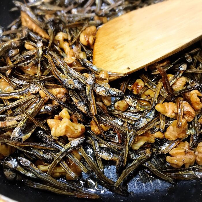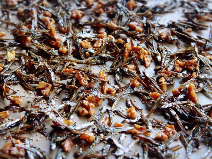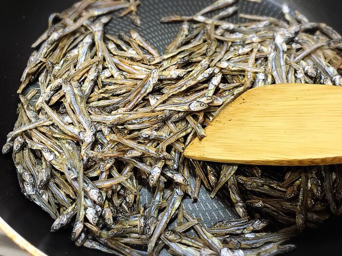 1.弱火で熱したフライパンで、小魚をから炒りしてザルに上げる。(手でポキっと折れるようになればベスト)。