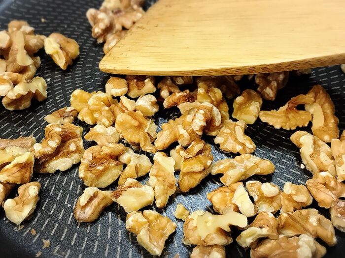 2.続けて適当な大きさに割ったクルミも香ばしくなるまでから炒りしてザルに上げる。