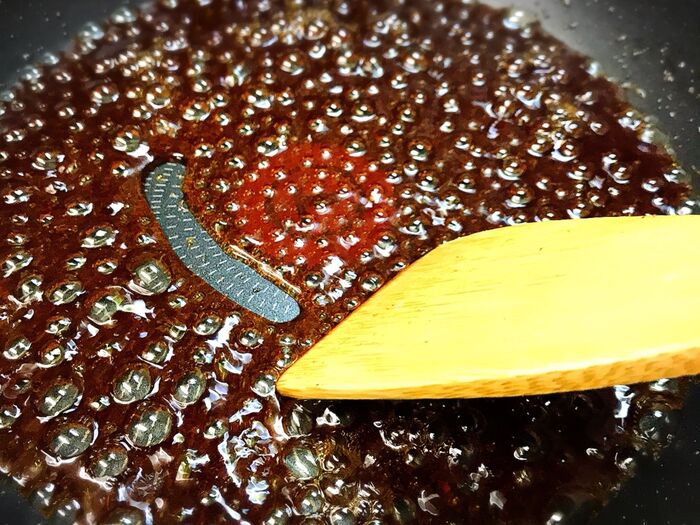 3.フライパンをさっと綺麗し、●を入れて中火にかかける。フライパンを揺すりながら砂糖を溶かし、沸騰したら更に少し加熱する。