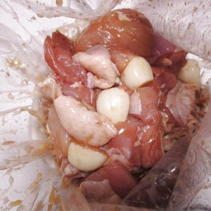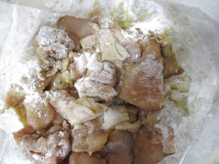 ステップ①:大きめの2重にしたポリ袋にカットした鶏肉を入れ、下味の#を入れもみ込む