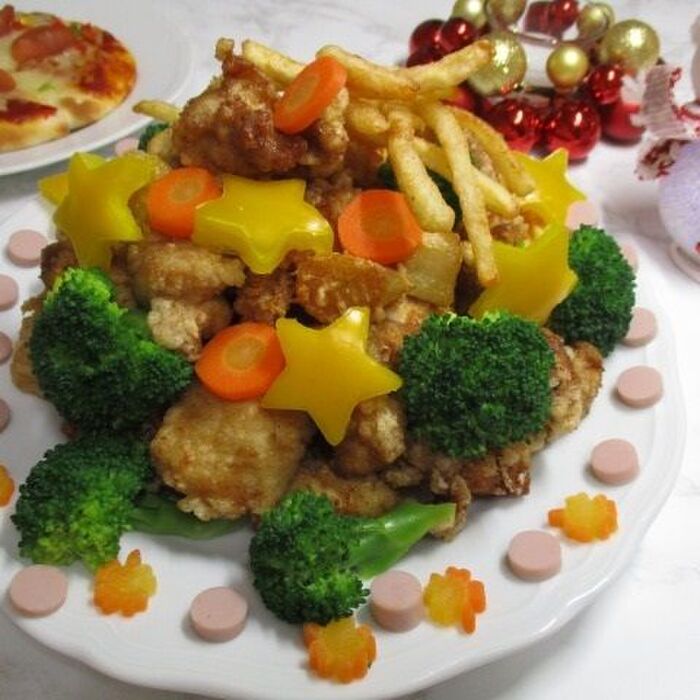 茹でて丸い形の人参、ブロッコリーと共に、から揚げを積み上げてゆきます、