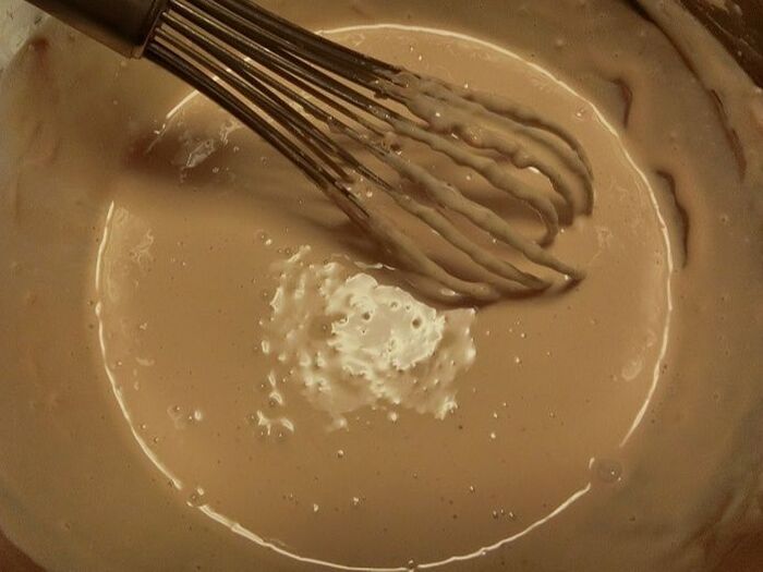 溶いた卵を少しずつ混ぜ合わせたら、生クリームを混ぜ合わせます。