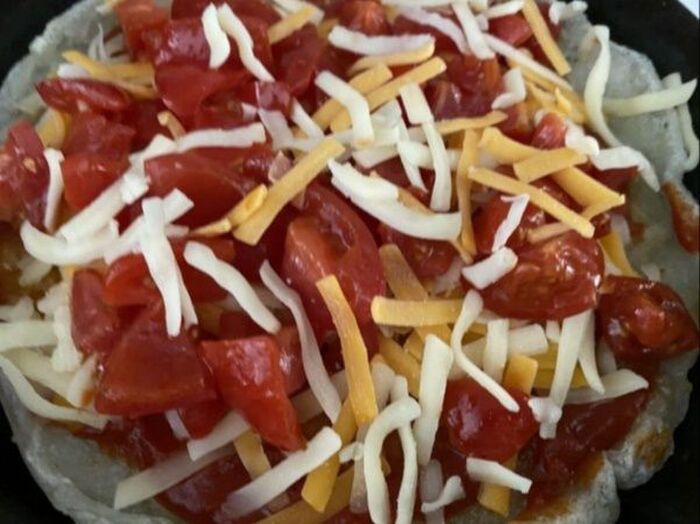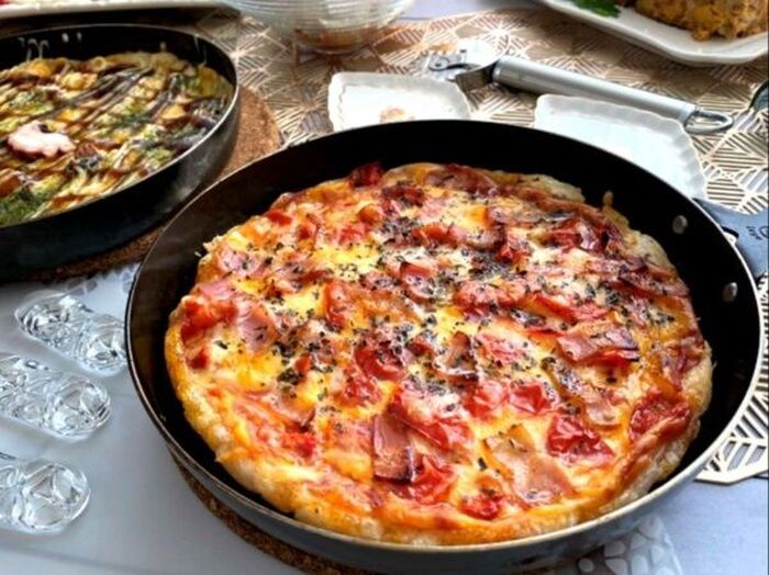 トマトソース ざく切りにしたプチトマト 短冊切りにしたベーコン チーズの半量をのせ