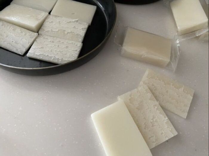 角餅3つの厚さを3等分してオリーブオイルを入れたフライパンに並べ弱火にかける