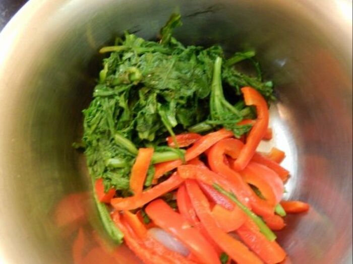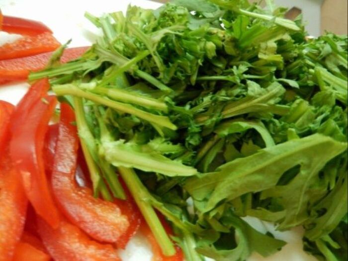 春菊は 根元のかたいところを切り落とし3㎝の長さに切り パプリカは