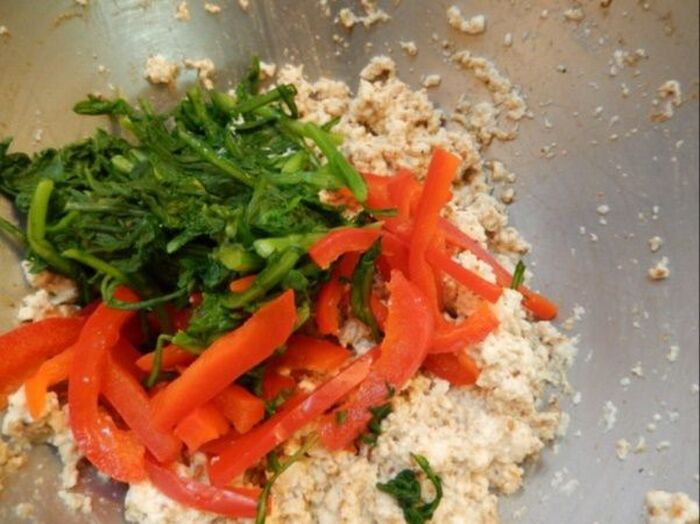 豆腐は荒く崩して熱湯で2分ぐらい茹でるか 600Wのレンジで1~2分加熱