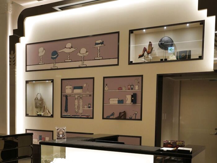 フロントや正面入口にはバッグ、帽子、アクセサリーなどがディスプレイされているのは、私も見ていて心が躍りました。