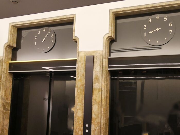 エレベーターホールの柱は以前の状態のまま大理石が使われていて、そこにブラックのモダンなイメージがプラスされ、昭和と現在が素敵にミックスされた落ち着いた空間になっています。
