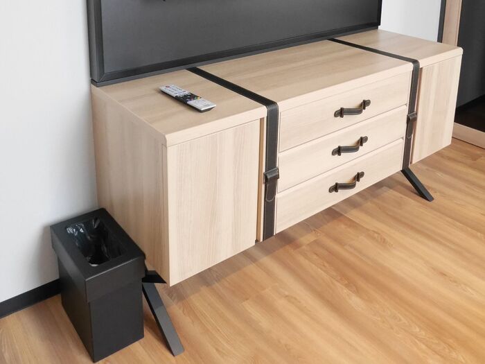 壁面や引き出しはトランクをイメージさせるインテリアになっているところも。