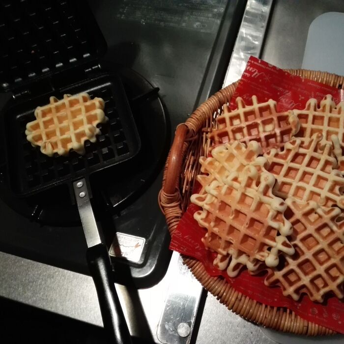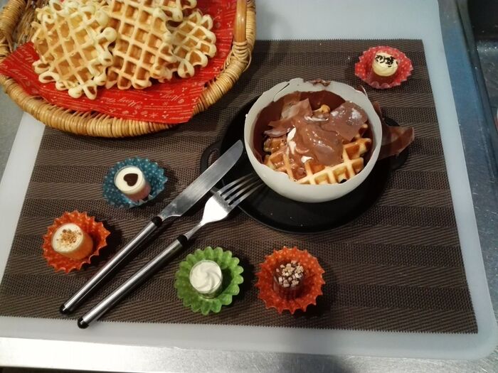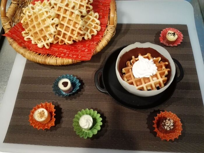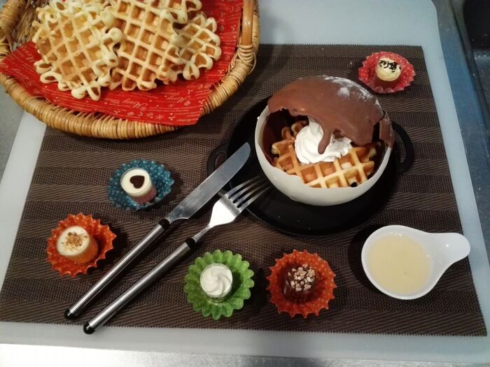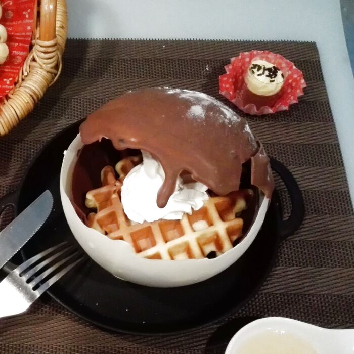 チョコを二重にした器にワッフルを乗せ、生クリームも