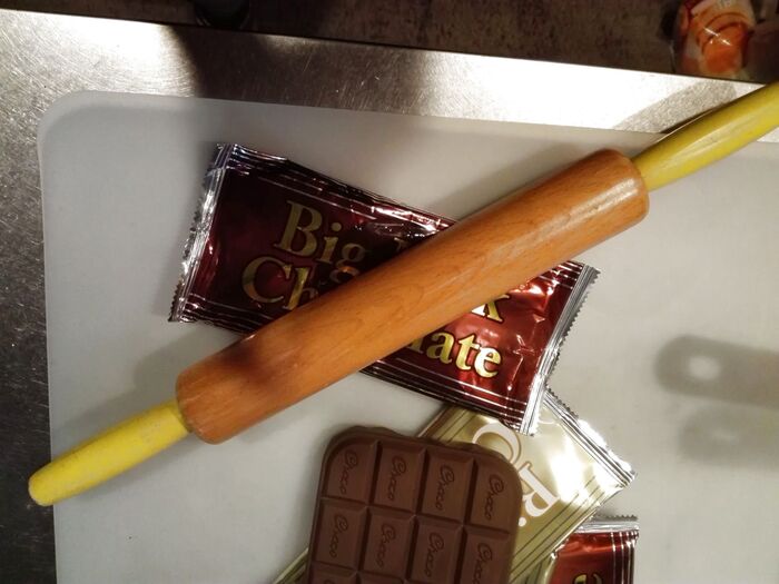 袋のまま板チョコを割り、更に棒で叩き細かくし