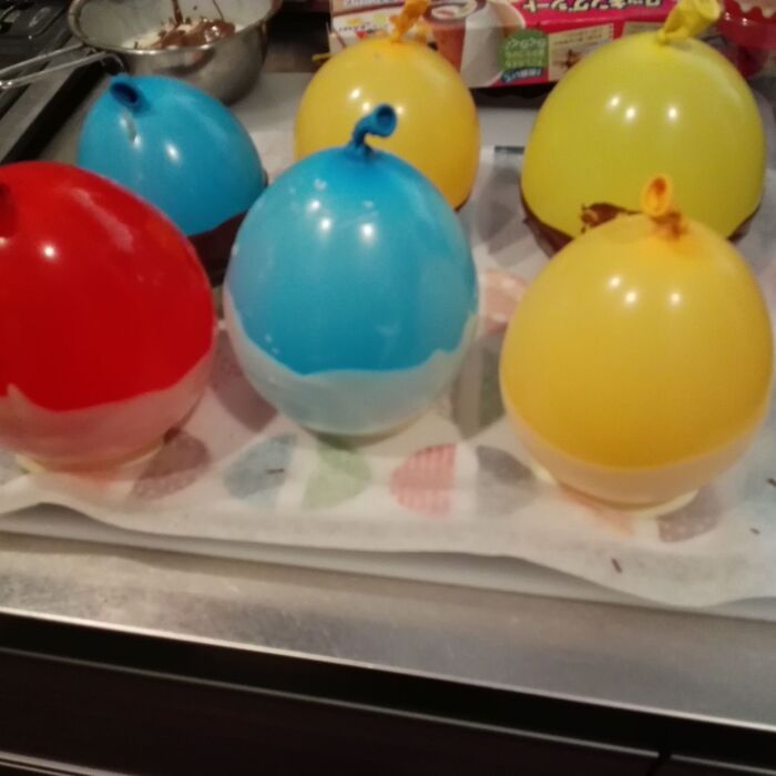数年前に、熱いままのチョコに風船を入れて大爆発😭💣破裂して、kitchenどころかlivingまでチョコまみれにした経験があるので‼