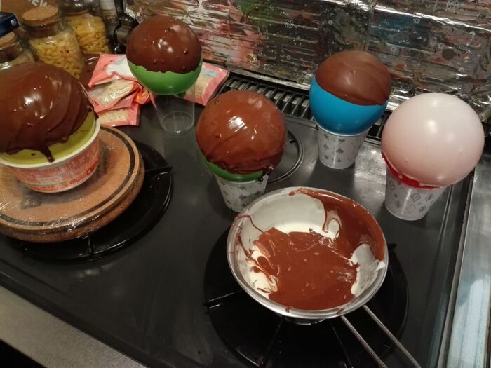 チョコレートの中に、風船を入れてチョコをまとわせます。