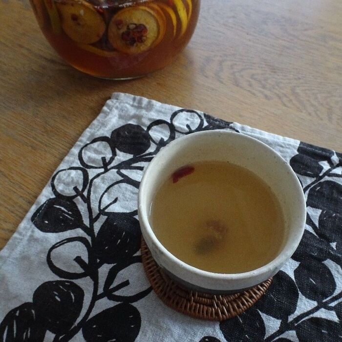 白湯で割って、クコの実を入れ癒しのTeaTime。です。