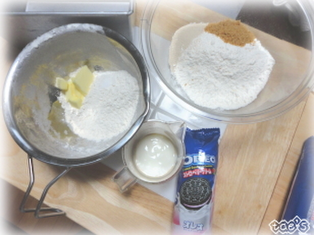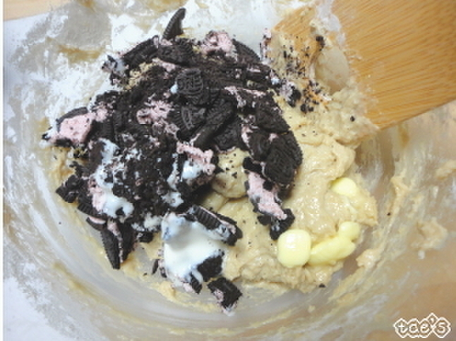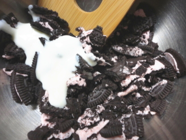 砕いた「オレオ ストロベリークリーム」(50g)を入れます。