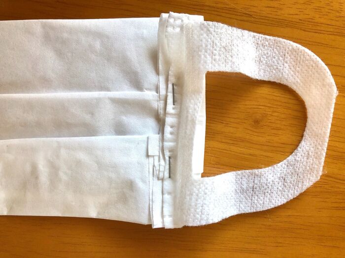 (使用後の市販マスクのゴムを使った場合も、やはりギャザーを寄せてからこんな感じで留めたらどうでしょうか。)