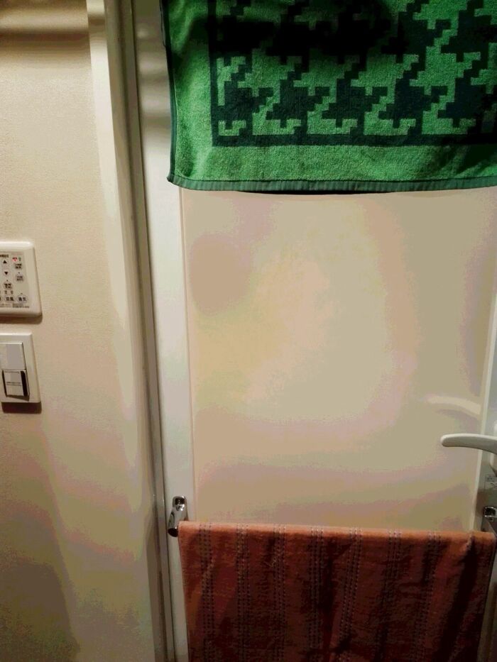 バスタオルは最後に、この様に最初からドアについている物と、突っ張りに2枚干す事で浴室乾燥の温かさで一緒に乾きます。