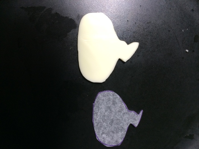 まず、チーズを切りたい形にクッキングシートに油性マジックで絵を描きます。水性だとこすると消えちゃうので、要注意!なるべく太めに書くと見えやすいです。マジックの所を残しながら周りをカット。それをチーズの上にのせて、待ち針でなぞるだけです!