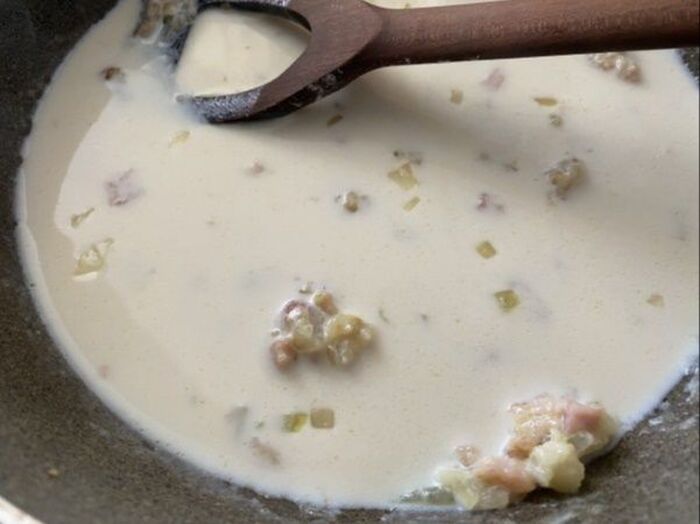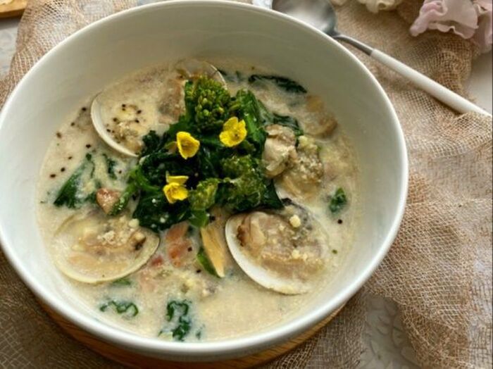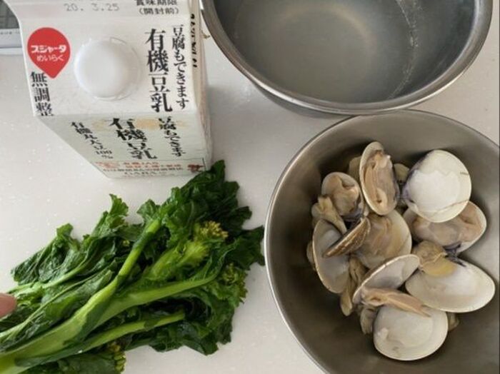 あさりの汁と水を加え沸騰したら豆乳 あさり 食べやすい大きさに切った菜の花を加え一煮立ちさせ 塩・コショウで味を調える
