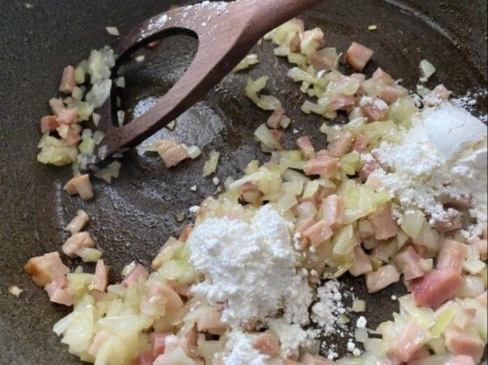しんなりしてきたら小麦粉を加え 粉っぽさがなくなるまでよく炒める