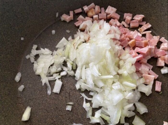 フライパンにオリーブオイルを入れ みじん切りにしたベーコンと玉ねぎ