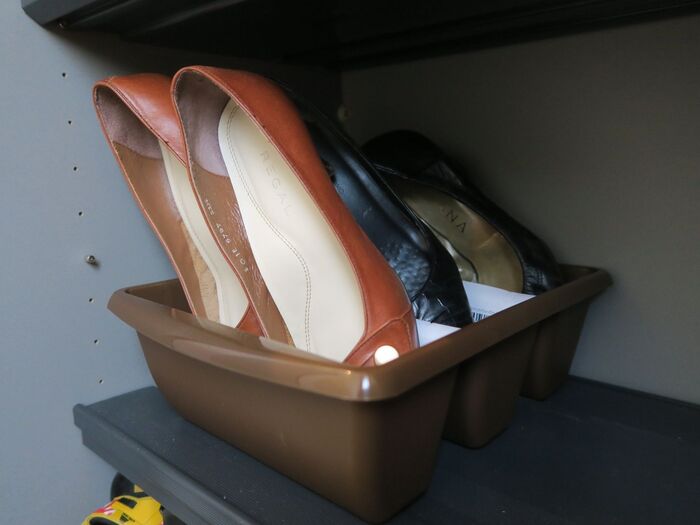 斜め横から見るとこのような図です。ヒールは若干アレンジが必要ですが、レディースの靴であれば3足きっちり収まります。
