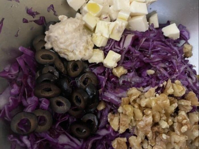 水気を叱りきってから 砕いたくるみ 輪切りにした黒オリーブ 小さな角切りにしたクリームチーズaの調味料を加え混ぜ合わせる