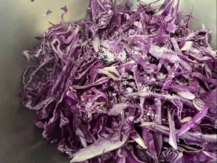 ★塩は余分な水分をとると同時に紫キャベツに味をつけるためにふります。
