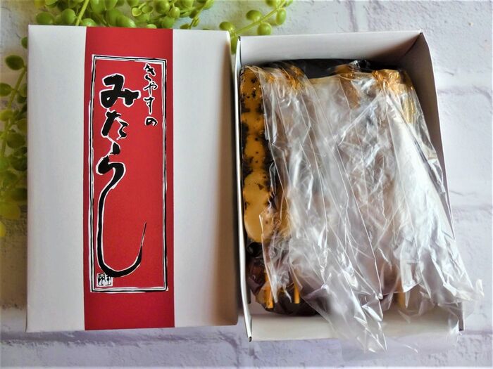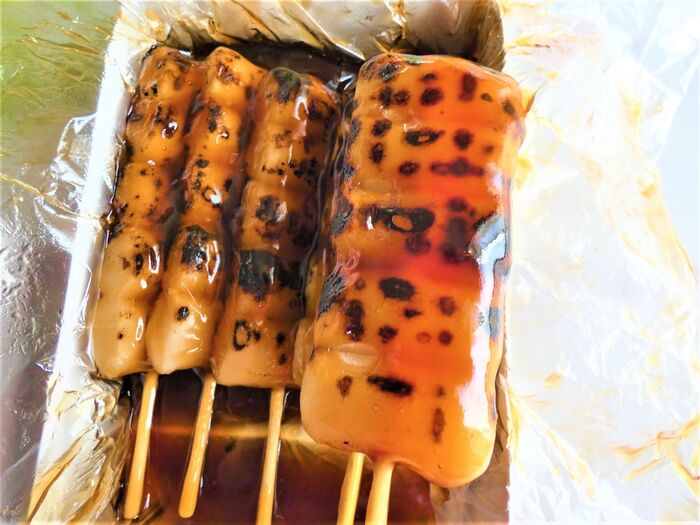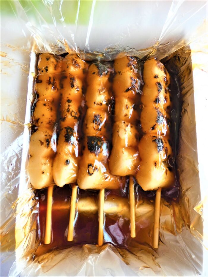 一つの串に俵型のお団子が、5個刺さっています。
