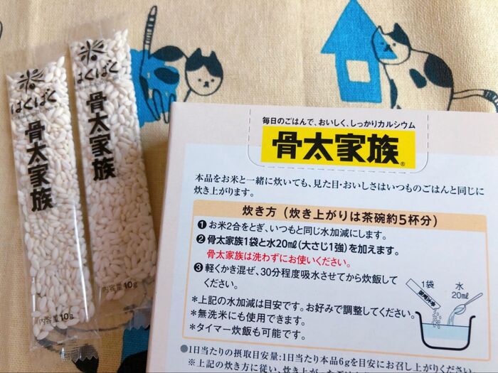 お米2合いつもの水加減に対して骨太家族1袋に水20㎖加えます♪30分程度の給水をして炊飯するだけの手軽さですよ♪