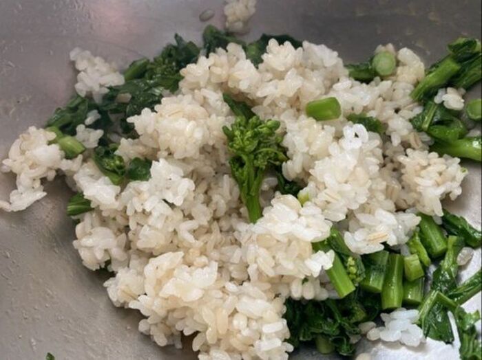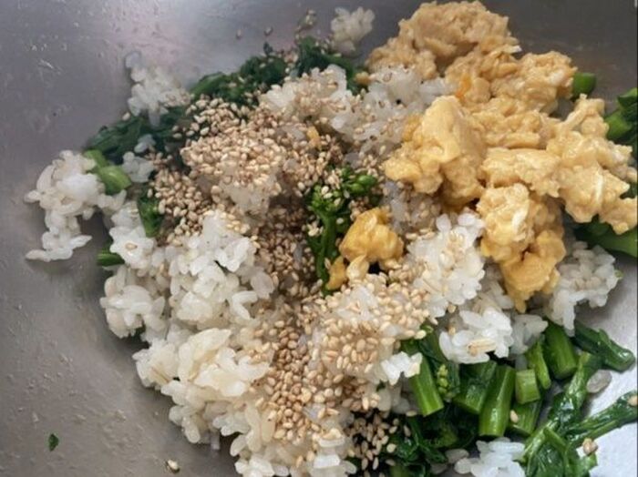 菜の花であえたご飯に 炒り卵と白ごまを加えざっくりと混ぜ合わせる