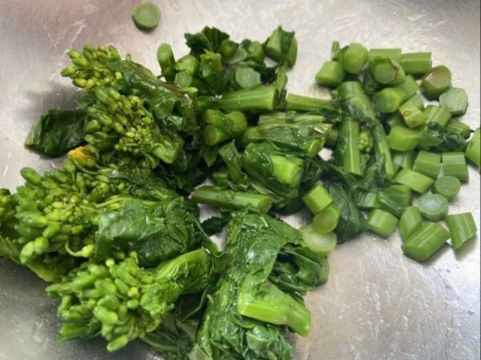 菜の花はさっと茹で 茎の部分は5㎜位上の部分は1,5㎝位に切って