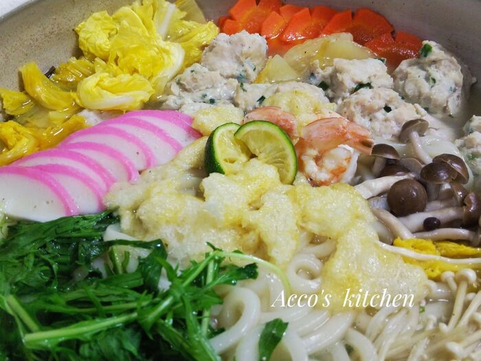 鶏団子と海老、昆布と煮干しの旨味が、うどんにジュワ~っとしみ込みます♡