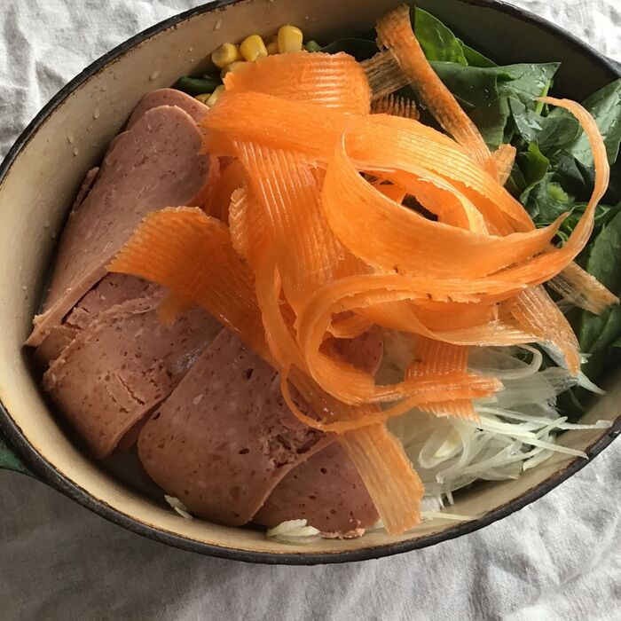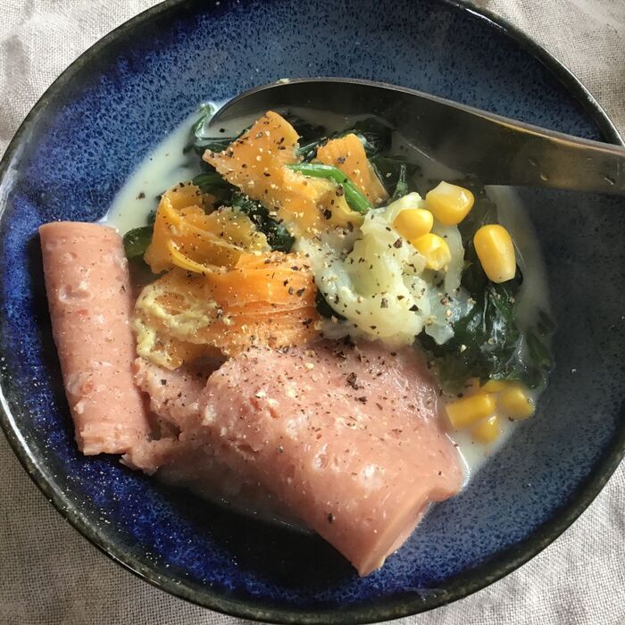 沸騰したら中火にして、スパム、ほうれん草、コーン缶、玉ねぎ、人参をいれて